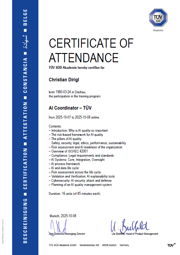 - Datenschutzbeauftragter & Auditor (TÜV SÜD)